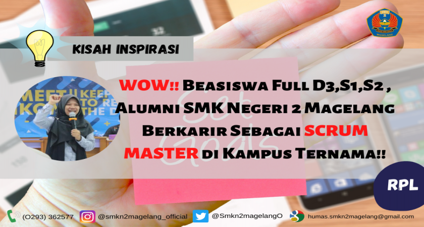 Tutik Maryana, alumni SMK Negeri 2 Magelang Jurusan Rekayasa Perangkat Lunak (RPL) tahun 2013. Awal kesuksesan dimulai ketika ia berhasil menyelesaikan studi dengan mendapatkan beasiswa full selama kuliah, mulai dari D3, S1, hingga S2 berhasil ia selesaikan dengan beasiswa penuh. Tahun 2020 adalah tahun bersejarah bagi kehidupannya, dimana ia terpilih sebagai Scrum Master di Universitas Islam Indonesia. Tidaklah mudah untuk menjadi seorang scrum master karena ia dituntut untuk dapat memberikan pemahaman mengenai nilai- nilai scrum, yaitu commitmen, courage, focus, openness dan respect.Tutik Maryana, alumni SMK Negeri 2 Magelang Jurusan Rekayasa Perangkat Lunak (RPL) tahun 2013. Awal kesuksesan dimulai ketika ia berhasil menyelesaikan studi dengan mendapatkan beasiswa full selama kuliah, mulai dari D3, S1, hingga S2 berhasil ia selesaikan dengan beasiswa penuh. Tahun 2020 adalah tahun bersejarah bagi kehidupannya, dimana ia terpilih sebagai Scrum Master di Universitas Islam Indonesia. Tidaklah mudah untuk menjadi seorang scrum master karena ia dituntut untuk dapat memberikan pemahaman mengenai nilai- nilai scrum, yaitu commitmen, courage, focus, openness dan respect.
