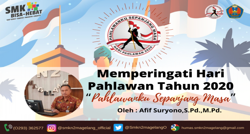 Hari Pahlawan tahun 2020 ini dengan mengusung tema “Pahlawanku Sepanjang Masa”, digelar pada saat bangsa kita baru menghadapi Pandemi Covid-19, marilah kita lawan bersama-sama. Ingatlah tidaklah Allah menurunkan penyakit kecuali dengan obatnya, manusia sebagai makhluk yang paling sempurna dituntut untuk berpikir menemukan obat dan menyikapi secara bijak menghadapi pandemi ini. Marilah kita patuhi protokol kesehatan sebagai suatu bentuk ikhtiar dan selalu berdoa.