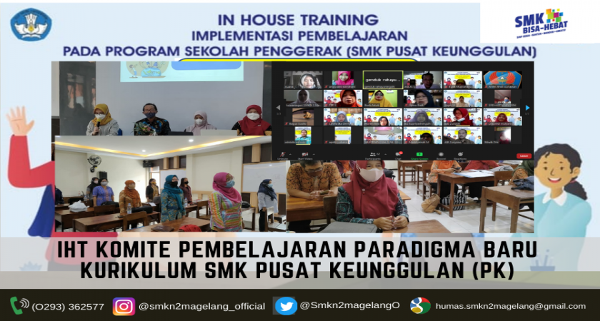 MAGELANG-SMK Negeri 2 adakan kegiatan In House Training (IHT) Komite Pembelajaran Kurikulum Paradigma Baru SMK Pusat Keunggulan (PK). Selasa(3/8/2021), Mila Yustiana,S.Pd., M.MPar. kepala sekolah, resmi membuka pelatihan diikuti oleh seluruh guru di ruang kelas sekolah setempat. Kegiatan diselenggarakan selama 7 hari dimulai tanggal 3-9 Agustus 2021 secara daring.